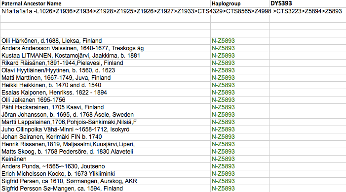 Apu löytyy Finland DNA -projektista, jonne moni BigY testin teettänyt on liittynyt. Sieltä löytyy lista N-Z5893 testituloksen saaneista. Otin kuvakaappauksen vanhimpien ilmoitettujen isälinjaisten esi-isien listasta.