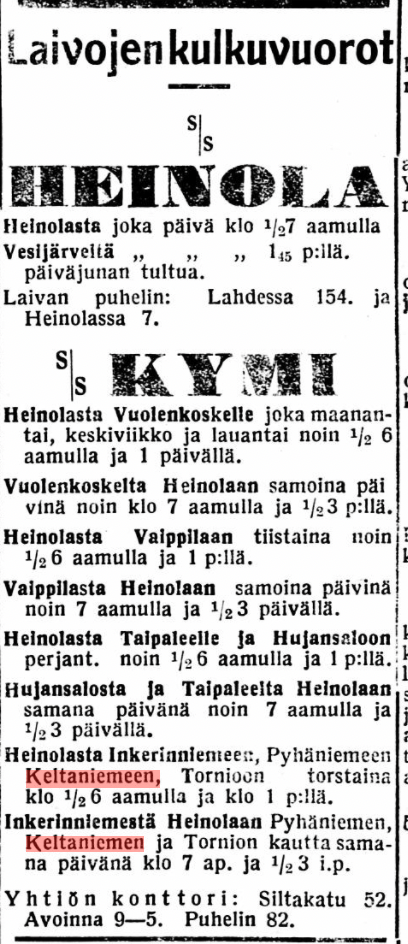 Kyselin laiturista Keltaniemessä lapsuudestaan asti asuneelta Alatalon vanhalta emännältä ja hän kertoi Lahdesta Päijänteen kautta Heinolaan matkanneista laivoista, jotka pysähtyivät Hietarannassa kenraali Sihvon aikana 1940- ja -50 -luvuilla. Tuntui uskomattomalta, että tavallisella mökkilaiturilla, jollaiseksi laiturin kuvittelin, olisi pysähtynyt laiva. Järvi on kyllä siinä kohtaa äkkisyvää, mutta olisiko sen syvyys riittänyt matkustajalaivalle?