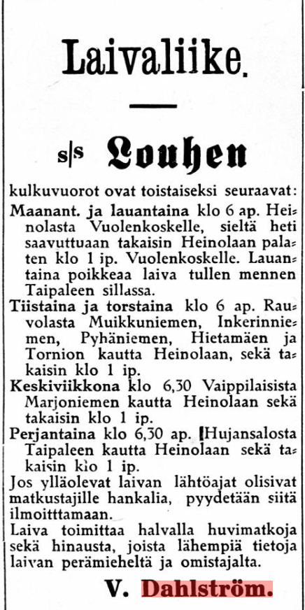 ’Louhi’ ei kuitenkaan ollut edes ensimmäinen Hietamäen rantaan pysähtynyt alus, sillä Heinolan Sanomista löytyy ilmoitus, joka kertoo s/s Heinola ja s/s Kymi -nimisten höyrylaivojen päästelleen höyryjään Hopeaselällä ja pysähtyneen Keltaniemessä jo kesällä 1920. Pysähtyivätkö laivat Hietarannassa jo tuolloin vai rakennettiinko Hietarantaan laituri vasta sen jälkeen, kun apteekkari Dahlström oli ostanut ’Louhen’ itselleen. Se jäänee arvoitukseksi ainakin toistaiseksi.