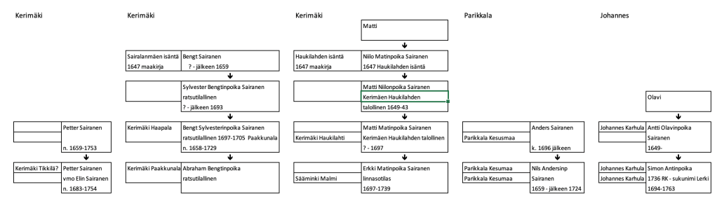 Lukiessani sukukirjaa Parikkalan kohdalta sieltä löytyi tieto, että paikkakunnan vanhin tiedetty Sairanen on vuoden 1631 maakirjassa mainittu Matts Pettersson. Voisiko kyseessä olla sama Matti Sairanen, joka viidentoista vuoden kuluttua löytyy Kerimäeltä? Voisiko olla, että Matti olisi jättänyt mieslinjaiset N-BY18941 haplohaarat molemmille paikkakunnille?