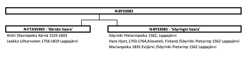 Puhun selvyyden vuoksi äitini isälinjan haplosta N-FTA95969 ’Kärnän haarana’, koska tuon haplon vanhin tunnettu esi-isä oli Antti Olavinpoika Kärnä. ’Söyringin haara’ N-BY33083 taas saa nimensä siitä, että sen kaikilla kolmella osumalla on mahdollinen isälinjainen yhteys Söyrinki Pietarinpoikaan.