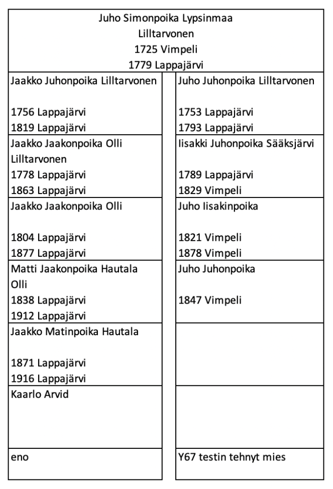 Juho Simonpoika Lypsinmaa-Lilltarvonen (1725-79) oli saanut Tarvolassa poikia, joista 1756 syntynyt Jaakko oli enoni isälinjaa. Jaakolla oli kolme vuotta vanhempi veli Juho, jonka Y67 testin tehnyt enoni dna-osuma oli merkinnyt isälinjansa vanhimmaksi. Näin pystyin turvallisin mielin päättelemään, että enoni isälinja oli sekä geneettisesti että kirjattuna yhtäpitävä ainakin 1700-luvun puoliväliin ja Lilltarvosen taloon asti.