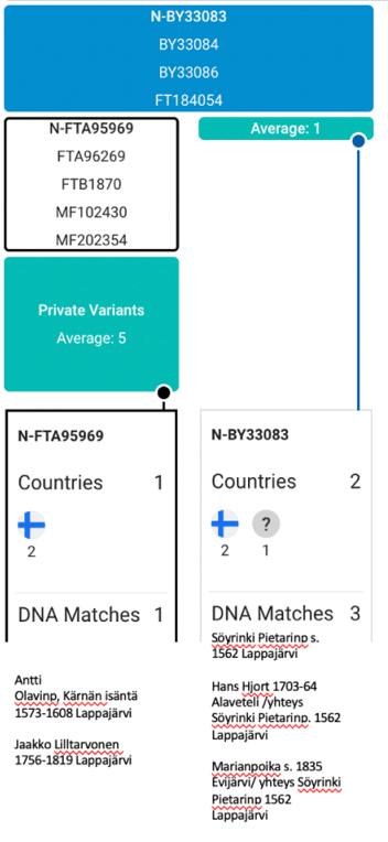Vain muutama kuukausi enoni ensimmäisestä BigY tuloksesta hänen haplonsa tarkentui, kun toinen BigY testin tehnyt oli osoittautunut enoni kanssa isälinjaiselta geeniperimältään yhtäläiseksi. Molemmat saivat haplokseen N-FTA95969 ja tuon toisen isälinjan vanhin oli Antti Olavinpoika, joka oli uudisasukkaana ja isäntänä Lappajärvellä myöhemmin Kärnänä tunnetussa talossa vuosina 1573-1608.