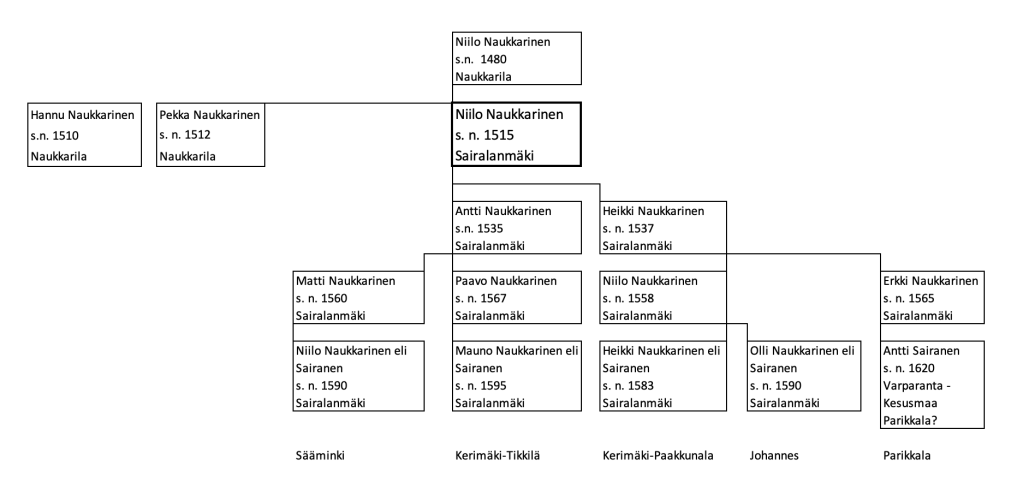 Mielenkiintoinen tieto olisi ollut missä Samuel Siiran isälinja oli 1500-luvulla, jolloin Sairasten esi-isä oli jo Kerimäellä Naukkarinen nimisenä. Tuo tieto olisi voinut avata sitä, mistä Kerimäelle on tultu.