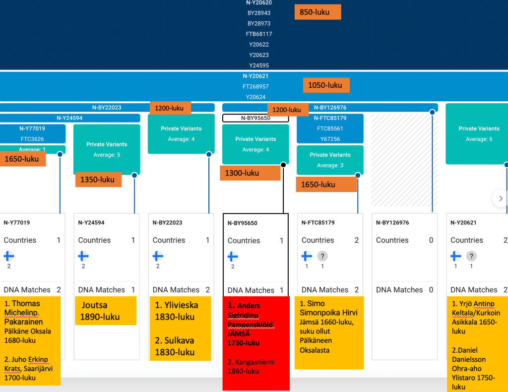 Mieheni vanhin tunnettu esi-isä on punaisessa laatikossa oleva Anders Sipinpoika Pampenskiöld, joka eli 1700-luvulla Jämsässä. Hänen kanssaan samaan haploon N-BY95650 kuuluu mies, jonka vanhin tunnettu esi-isä on elänyt 1860-luvulla Kangasniemellä. Koska nämä kaksi miestä ovat saman haplon miehiä, heillä on varmasti yhteinen esi-isä menneisyydessä.