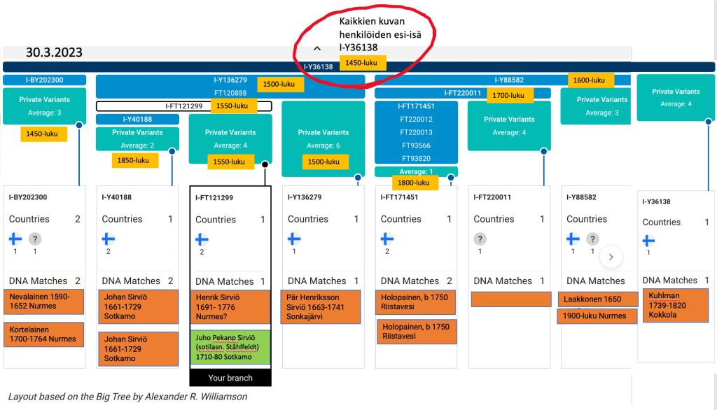 Kuvan keltaisiin ’laatikoihin’ olen koonnut tietoja FTDNAn DiscoverTM antamista aika-arvioista siitä, milloin kyseisten haplojen osumien yhteinen esi-isä on elänyt. Sen perusteella esim. kuvan vasemmassa laidassa olevien Nevalaisen ja Kortelaisen yhteinen esi-isä I-BY202300 on elänyt noin 1450-luvulla.
