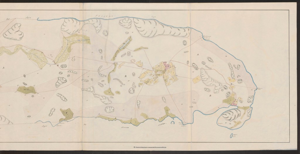 Kuva: Maanmittaushallituksen uudistusarkisto – H2:6/1-3 Keltaniemi; Keltaniemen yksinäistalo: isojaonkartta ja jakokirja 1818-1818, jakso 2; Kansallisarkisto: https://astia.narc.fi/uusiastia/viewer/?fileId=5946554857&aineistoId=2542693990