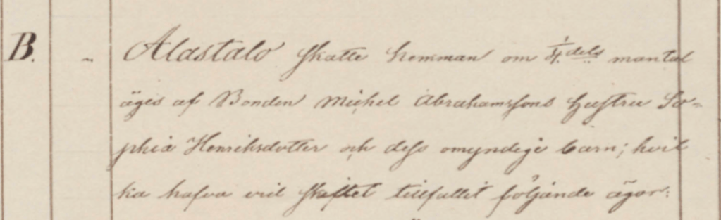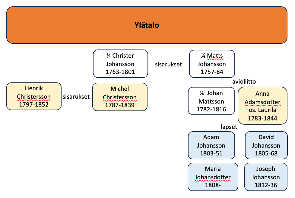 Matts Johanssonin 1/4 osan oli perinyt jo 1700-luvun puolella hänen poikansa Johan Mattsson, joka oli kuollut kuumetautiin joulukuussa 1816. Johanin jälkeensä jättämää osuutta hallinnoi hänen leskensä Anna Adamsdotter, jonka veli Erik Adamsson Laurila Kopsuolta toimi edunvalvojana Johanin ja Annan lapsille. Sama Erik Adamsson Laurila oli edunvalvojana myös Alatalon lapsilla.