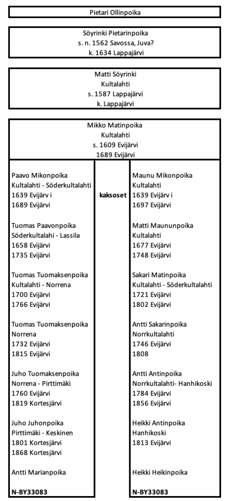 Helmikuussa 2024 tuli N-BY33083 haploon neljäs osuma ja tämän osuman mieslinja johtaa Söyrinki Pietarinpoikaan hänen poikansa Matin kautta, kuten aviottoman pojan linjakin. Nämä kaksi linjaa haarautuvat 1600-luvun alkupuolella Evijärvellä, jossa Söyrinki Pietarinpojan pojanpoika saa kaksoset. Näiden kahden pojan jälkeläiset ovat saaneet BigY testissä haplokseen N-BY33083. Ja vaikka toinen näistä linjoista kirkonkirjojen mukaan katkeaakin isättömyyteen, Ydna kertoo näiden kahden mieslinjan olevan läheistä sukua keskenään.