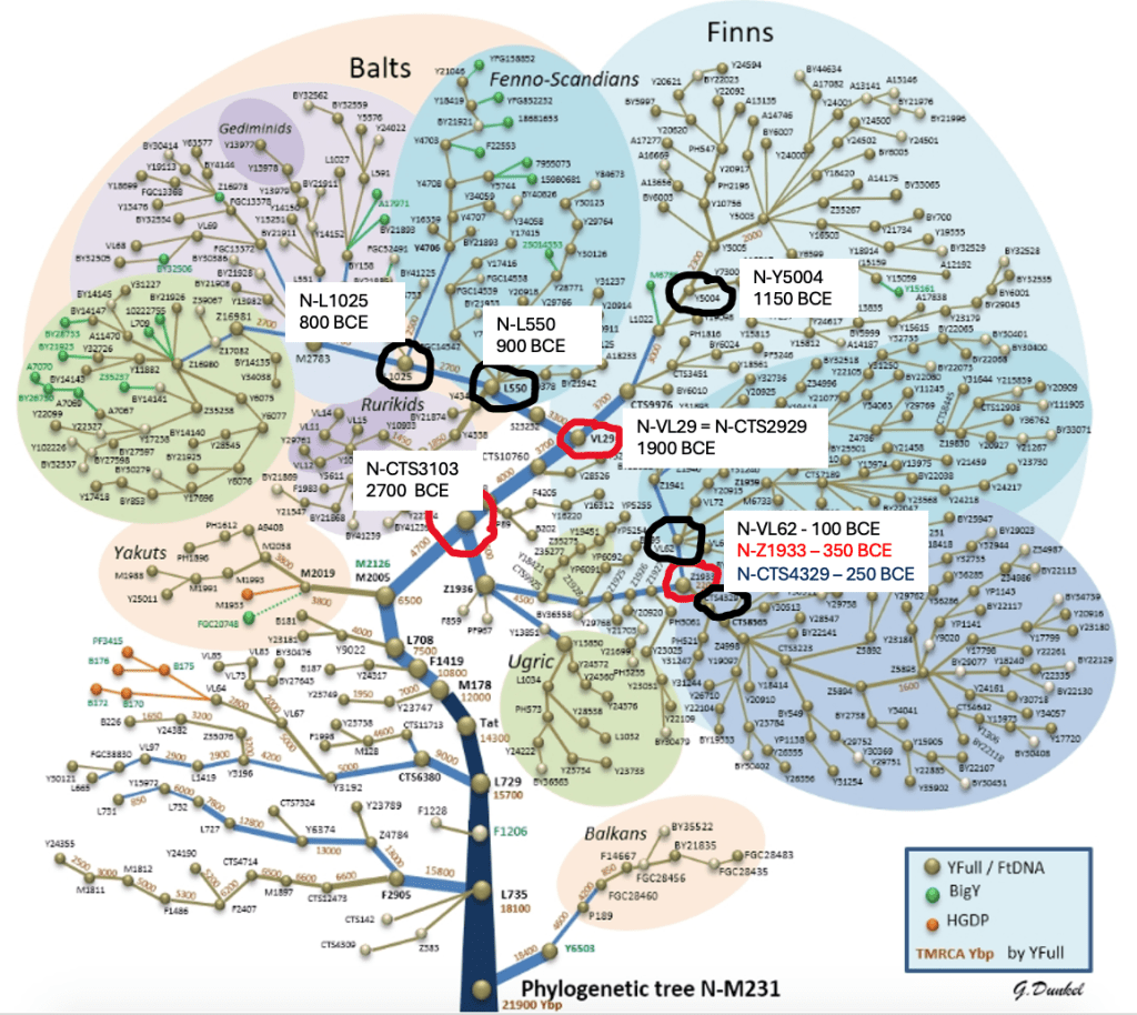 Näiden kahden tulosuunnan yhteinen esi-isä on elänyt noin 2700 vuotta ennen ajanlaskua Volgan mutkassa (N-CTS3103).
