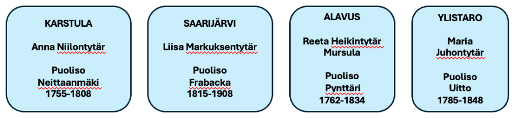 Onnekseni olen vuosien saatossa tehnyt pohjatyön hyvin, ollut yhteydessä osumiini ja saanut heiltä tietoa heidän äitilinjoistaan. Lisäksi olen kerännyt tietoa sukututkimuksista ja tehnyt tutkimuksia kirkonkirjoista niissä linjoissa, joissa vanhimmaksi tunnetuksi esiäidiksi on merkitty joku 1800-luvulla syntynyt nainen. Ja kaikkein tärkein: kirjannut kaiken muistiin!