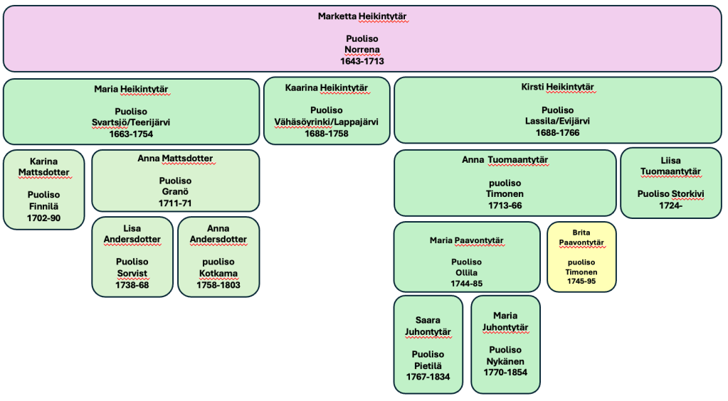 Norrenan Marketta on naispuolisten jälkeläislinjojen ja niiden testauksen puolesta todellinen matriarkka! Hänellä on 11 mtDNA testin tehnyttä jälkeläistä, jotka kuuluvat kolmen eri tyttären linjoihin. Nämä tyttäret avioituivat eri paikkakunnille ja näin levittivät Marketan mtDNA:ta laajalle.