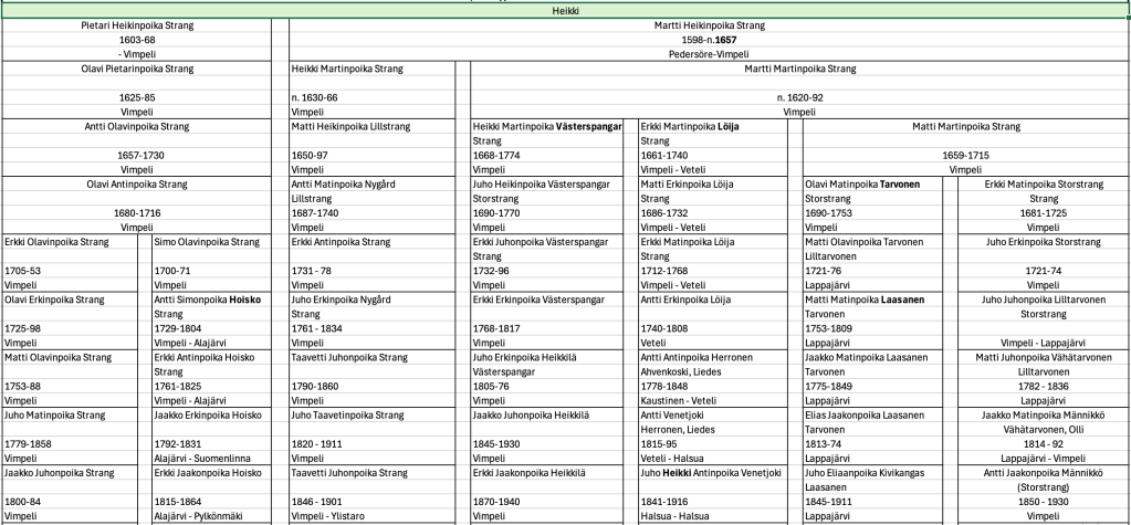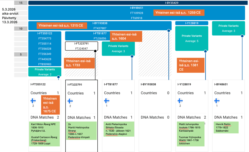 Viime syksynä päätimme pikkuserkkuni Minnan kanssa korottaa hänen isänsä Sauli Kivikankaan Y67 testin BigY:ksi, jotta saisimme Strangien tarkemman haplon selville. Tulos tuli helmikuun lopulla 2026 ja haploksi saatiin I-FTB1877. Samassa haplossa odotti jo toinen testattu, jonka esi-isäksi oli merkitty Pietari Johanpoika Sissala n. 1500. Palaan tähän myöhemmin.