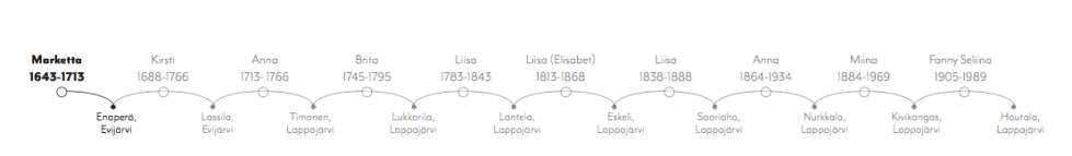 Tällainen naispolku, äitilinja, on on minun kohdallani. Me kaikki ja meidän kaikkien naispuoliset jälkeläiset jatkamme mtDNA linjaamme T1a1. Marketta Heikintytär Enaperä eli Norr-Ena (n.1643 - 1713 Evijärvi) 2. Kirsti Heikintytär Enaperä - Lassila (n. 1688 - 1766 Evijärvi) 3. Anna Tuomaantytär Lassila - Timonen (1713 - 66 Lappajärvi) 4. Brita Paavalintytär Timonen - Lukkarila (1745-95… Jatka lukemista Äitilinjani Lappajärvellä 1643 – 1989